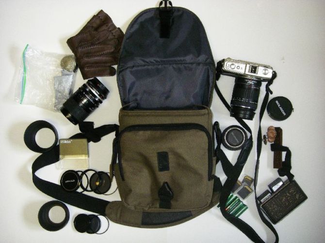 The bag itself is a Tamrac Express 6 http://www.tamrac.com/3536.htm , carefully selected on the basis of being won for a minimum bid on eBay at a cost, shipped, of less than $10. The bag has two partitions that divide the main compartment into a center/top section with two side sections. The bag is typically loaded as follows: